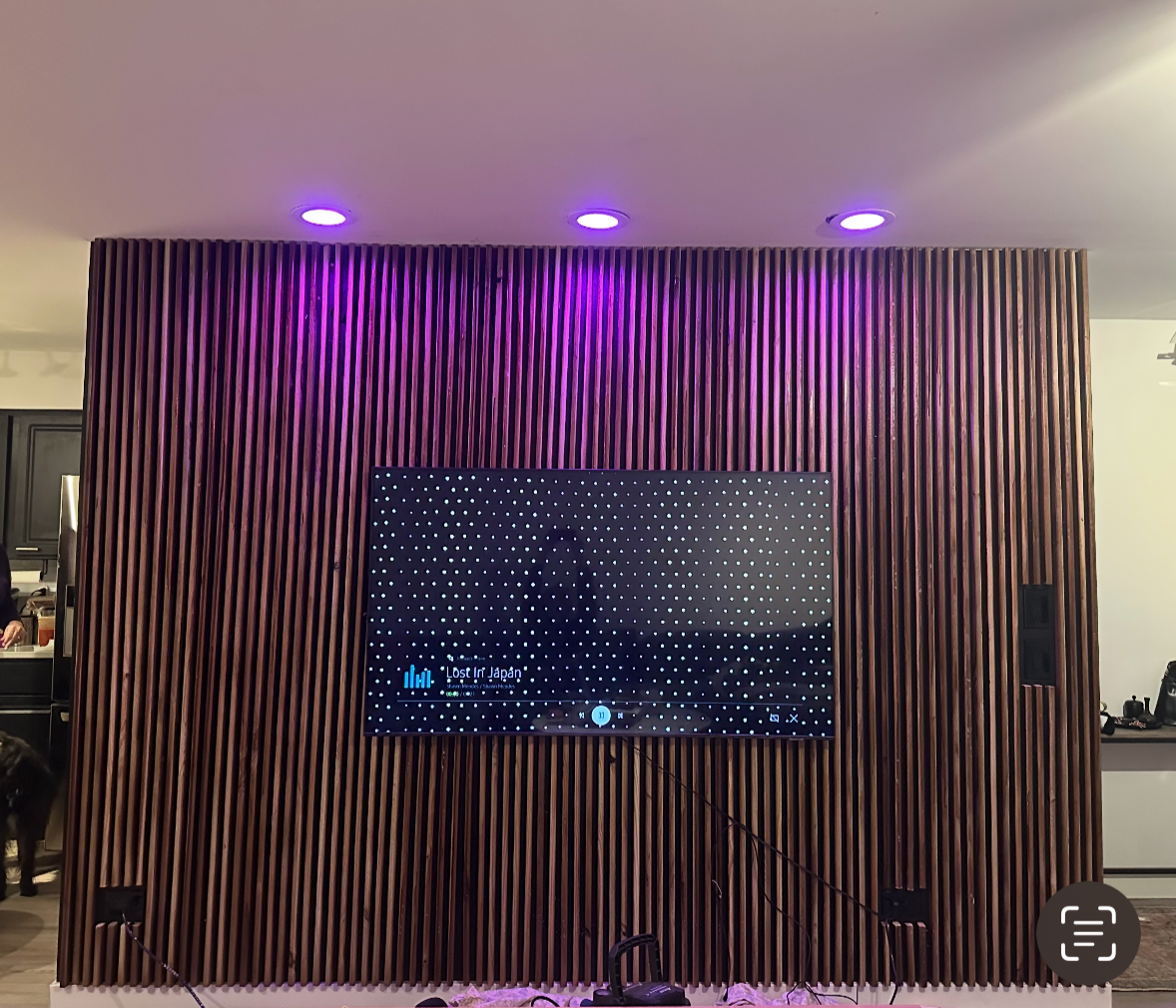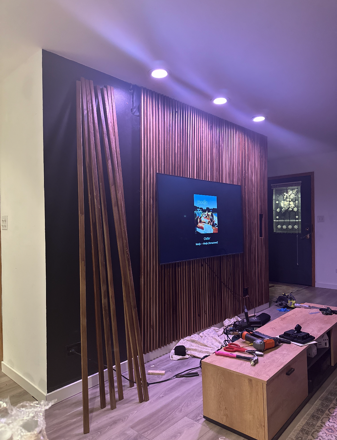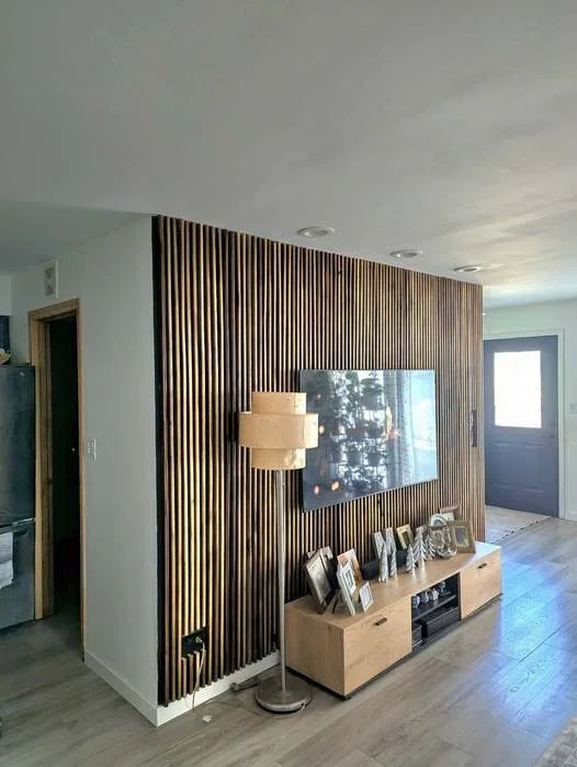 The original surface-mounted light fixtures were replaced with recessed can lighting to create a cleaner ceiling plane and more controlled, even illumination. The base wall was painted black to add depth and allow both the television and the wood elements to visually recede into the space rather than stand out as separate objects. Vertically oriented wooden slats were then installed to introduce texture and rhythm, with their orientation intentionally chosen to emphasize height and give the wall a more architectural presence.